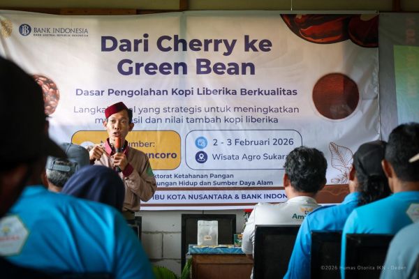 NUSANTARA - Otorita Ibu Kota Nusantara (IKN) menjalin kerja sama dengan Sekretariat Kerja Kantor Bersama Bank Indonesia dalam penyelenggaraan pelatihan peningkatan kapasitas petani kopi liberika di kawasan Agro Wisata Sukaraja, Senin (2/2/2026). Kegiatan ini menjadi bagian dari upaya mendorong penguatan ekonomi lokal melalui peningkatan kualitas dan daya saing komoditas unggulan masyarakat di wilayah penyangga IKN.